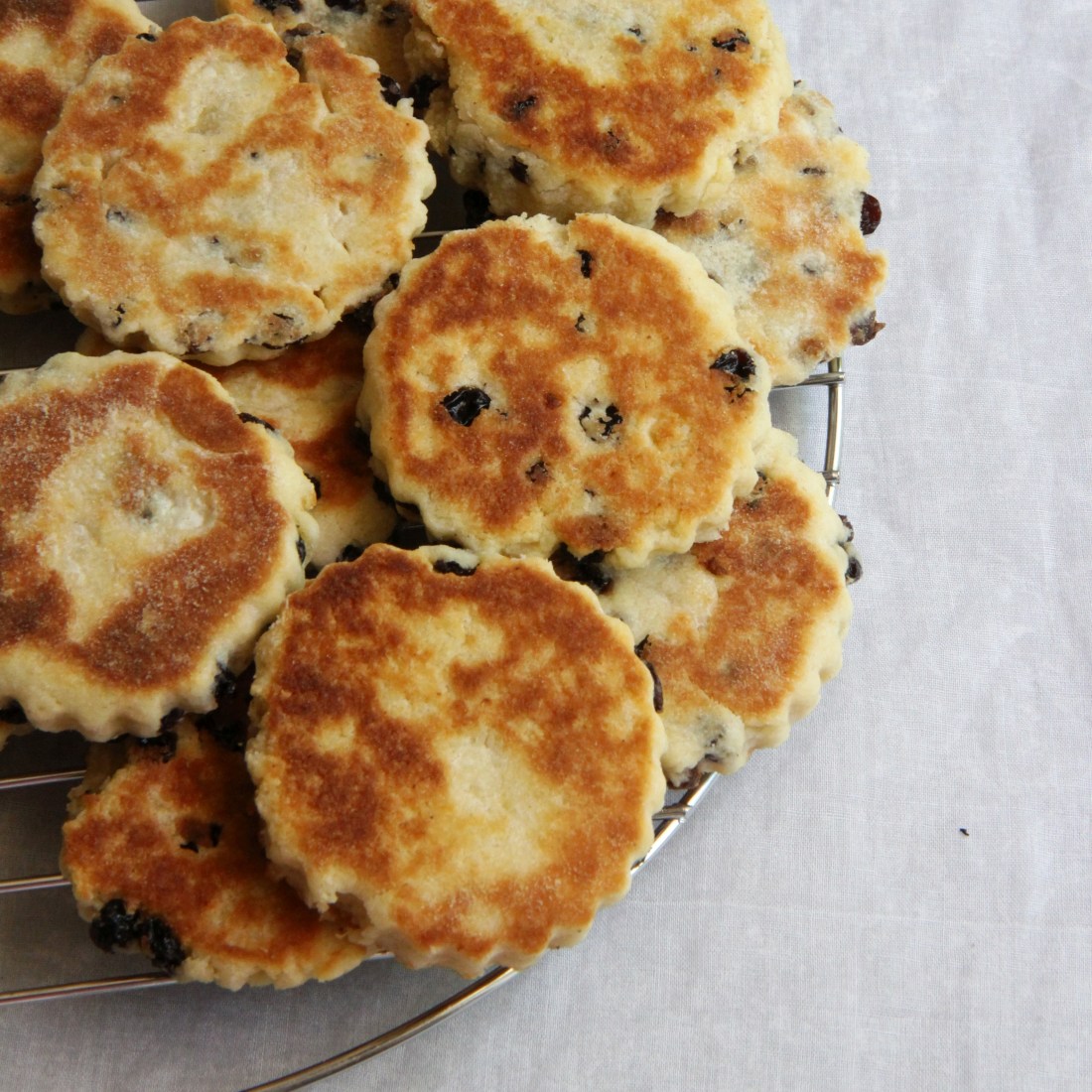 In a food processor whiz together the flour, sugar, butter, spice and baking powder until the mixture resembles coarse breadcrumbs. You can also do this by hand, rubbing the butter into the dry ingredients as you would when making scones. Tip out into a medium sized bow and add the egg and currants. Knead lightly until the dough comes together and is similar in texture to a pastry dough. add a tiny splash of milk if it is too dry. Dust a work surface with a little flour and roll out the dough until it is about 15 mm thick. Use a round plain or fluted cutter to cut out the cakes. Cook on a griddle or thick based frying pan over medium heat, until golden brown, turning once. Don’t have the heat too high or else you will have gooey insides to your Welsh cakes. A bit like a scone, and a bit like a biscuit, Welsh cakes have a very distinctive, slightly crumbly and not very moist texture and they are best eaten within a couple of days.